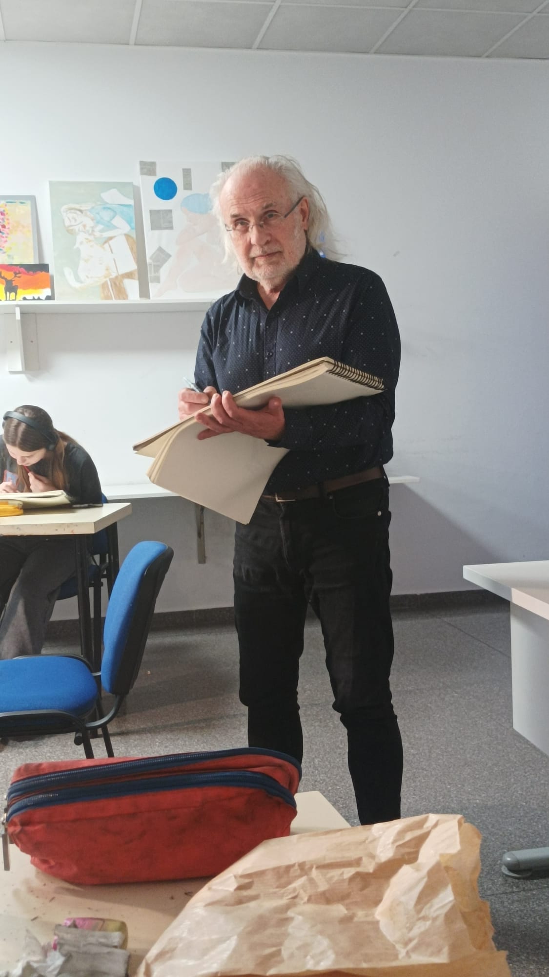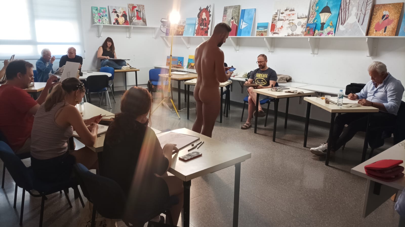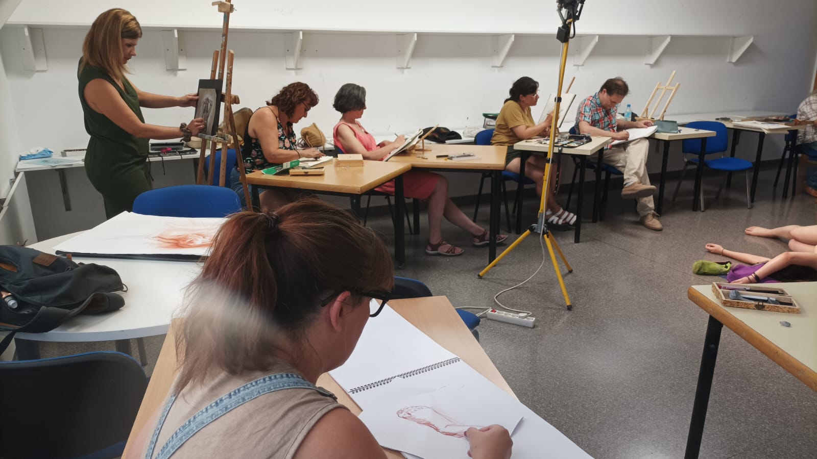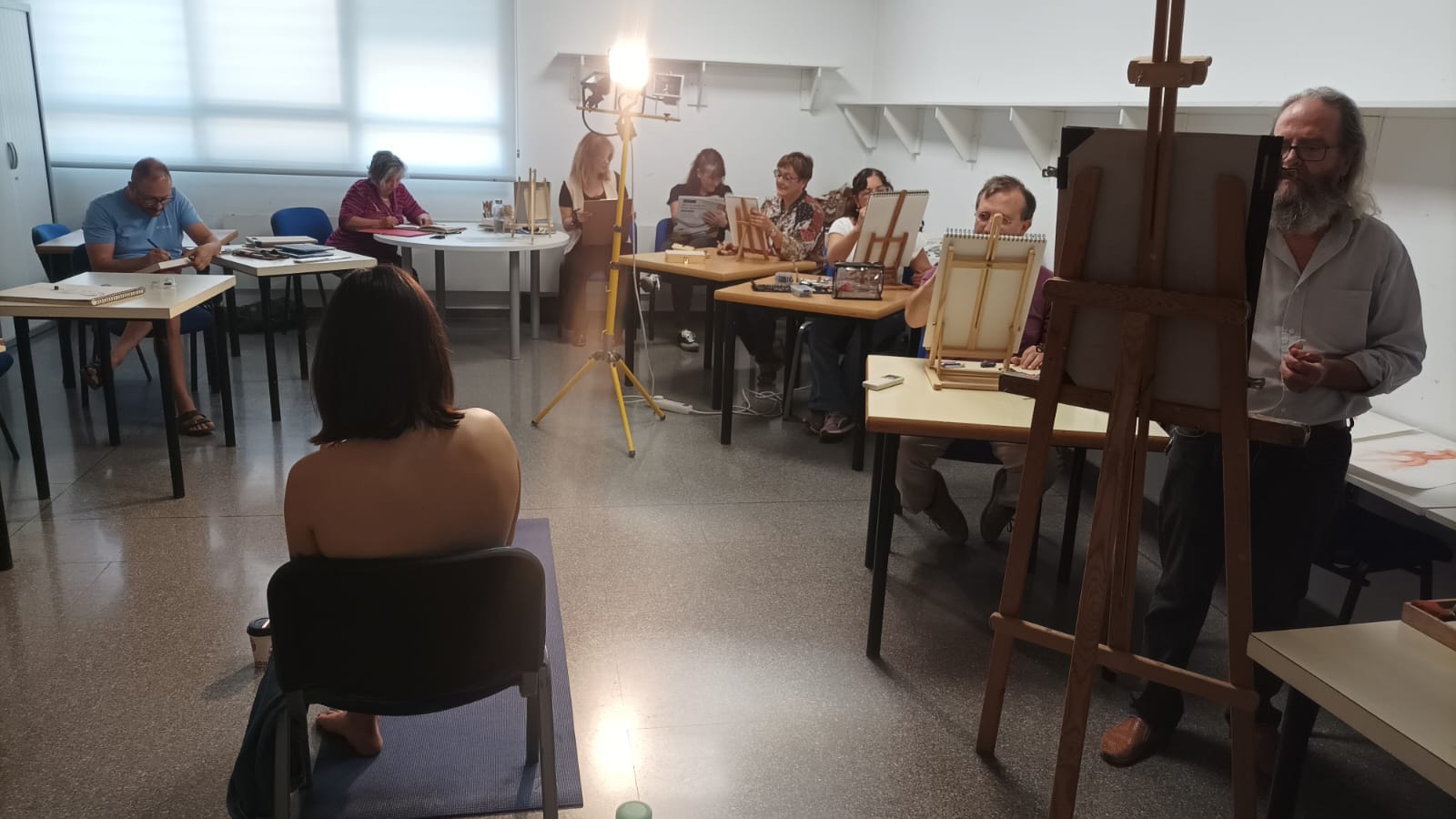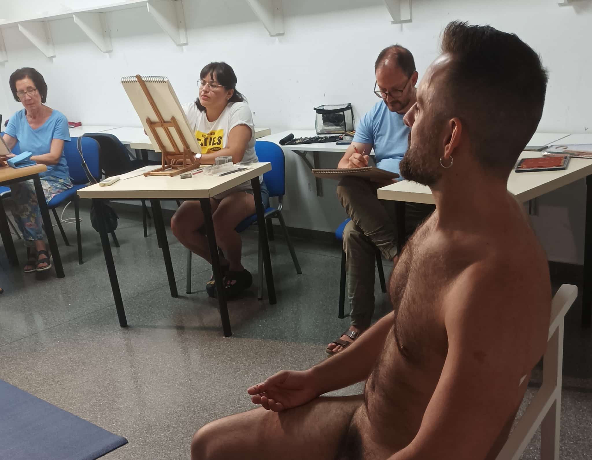 Los participantes pueden dibujar o pintar a su aire. Si lo prefieren, a quienes lo deseen, Juan Espallardo les explica cómo aborda cada pose y les comenta sus dibujos, sugiriendo eventuales correcciones.