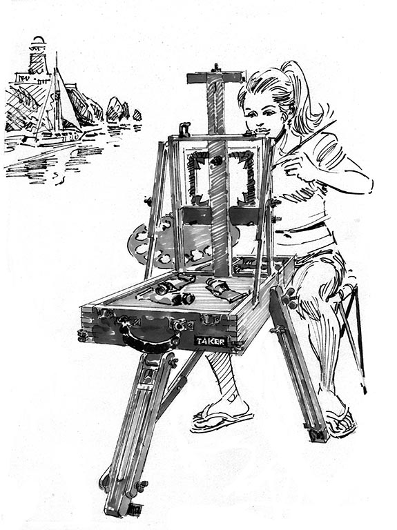 • Su caballete de campaña, lienzo o lienzos y óleos y pinceles, aguarrás, etc..
