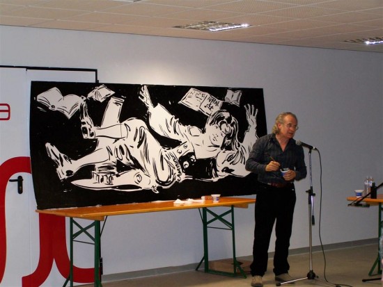 Por último, al final de este catálogo, encontrarán la lista que he improvisado (lo de improvisar es un decir, puesto que me ha llevado meses el prepararla con la inestimable colaboración de mi amigo Gabino Busto Hevia) reuniendo a todos los que yo considero grandes dibujantes, con indicación de las obras de cada uno de ellos que me permito recomendarles, precisando editor español y reciente, siempre que ello resulta posible. Si algunos colegios, instituciones o aficionados a los tebeos deciden poner manos a la obra, guiándose por esta lista, y adquieren aunque sólo sea un quince o un veinte por ciento de esos tebeos, ya tendrían una excelente representación de las mejores historietas de toda su corta historia. Incluso si alguien únicamente comprase uno de estos tebeos, tendría la certeza de que se trata de un tebeo bien dibujado.